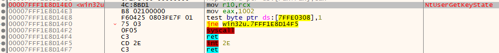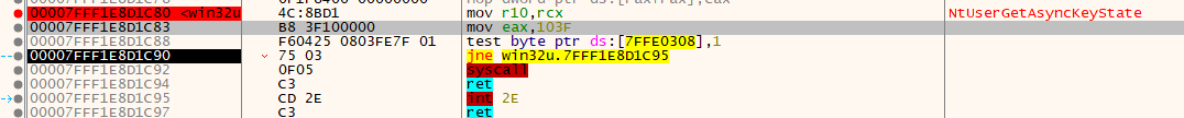 GetAsyncKeyState classic call without any direct/indirect syscall. Stack before syscall of NtUserGetAsyncKeyState.